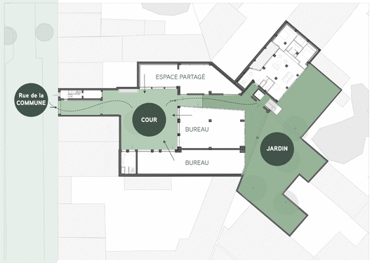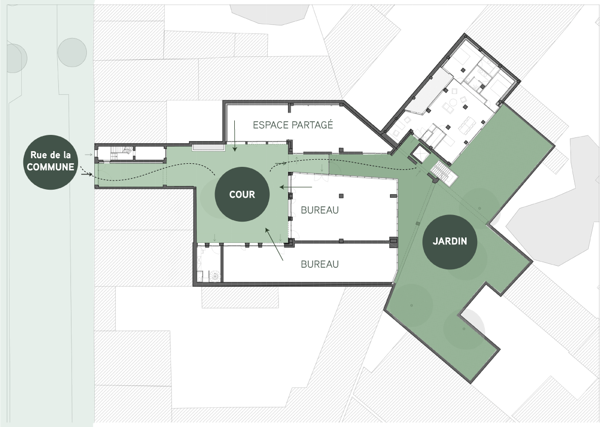 Il s’agit de tisser du lien social entre les acteurs du projet notamment en le montant ensemble de A à Z mais également avec le quartier en laissant l'espace public percoler dans la cour où prennent place les fonctions communes.