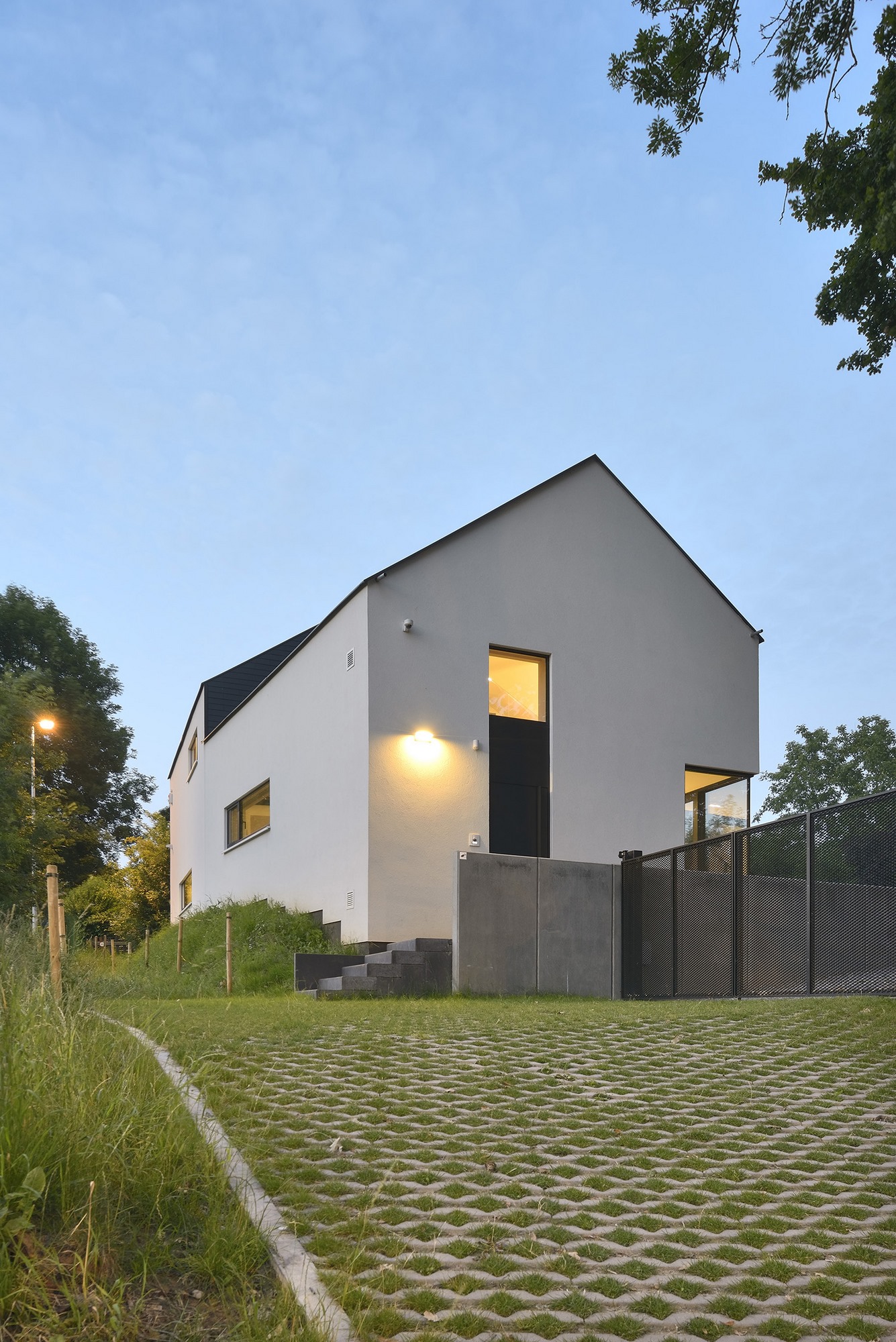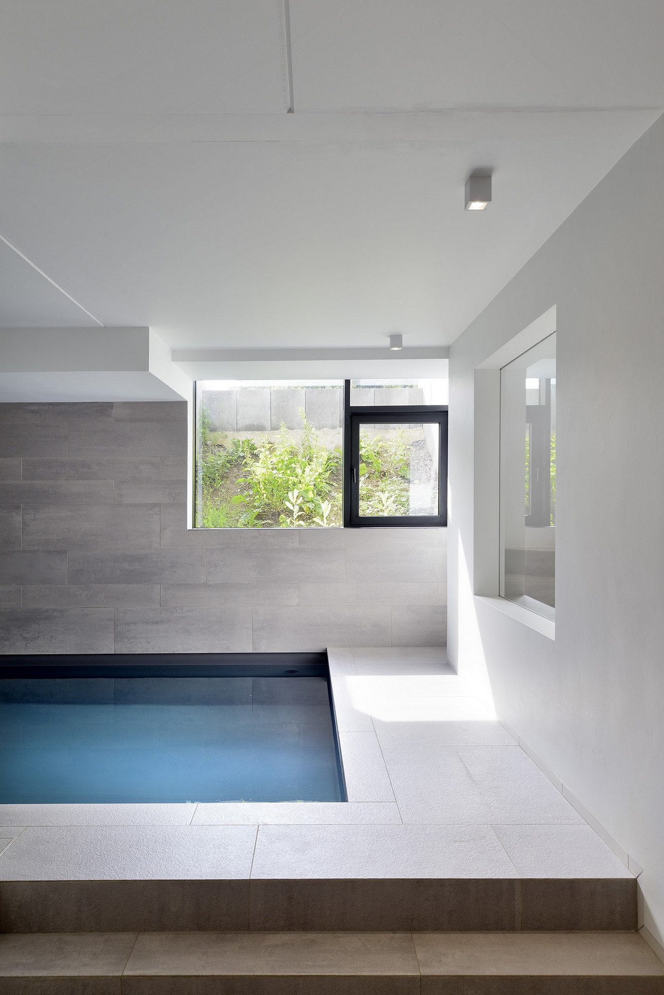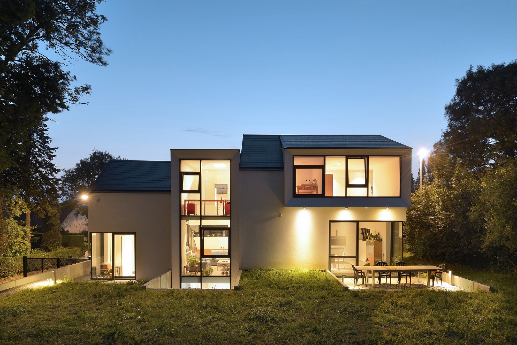 Le projet prend le parti de réduire au maximum le volume des bâtiments annexes et de l’intégrer dans un travail paysager. Depuis la rue, l’habitation conserve sa typologie existante : un ensemble de deux volumes rez + 1 de petite taille avec toitures à versants.