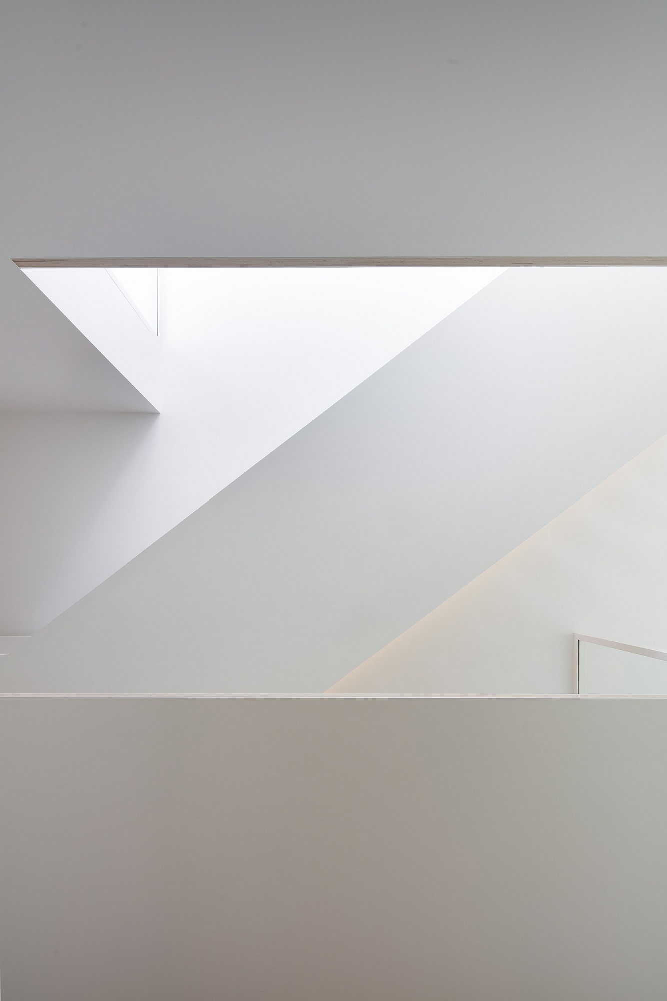 La travée de gauche comporte des espaces traversant de la façade avant à la façade arrière pour une liaison des espaces tant horizontale que verticale. Cette travée est la travée de la connexion et de la circulation. L’ouverture verticale, allant jusqu’en toiture, permet de profiter des apports de lumière naturelle variant au fil de la journée.