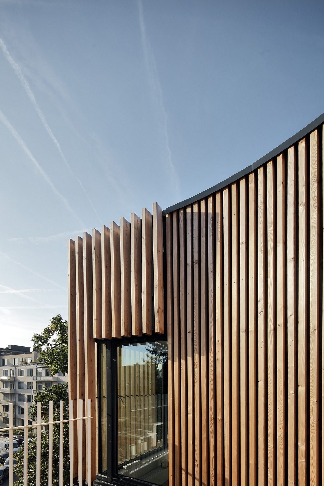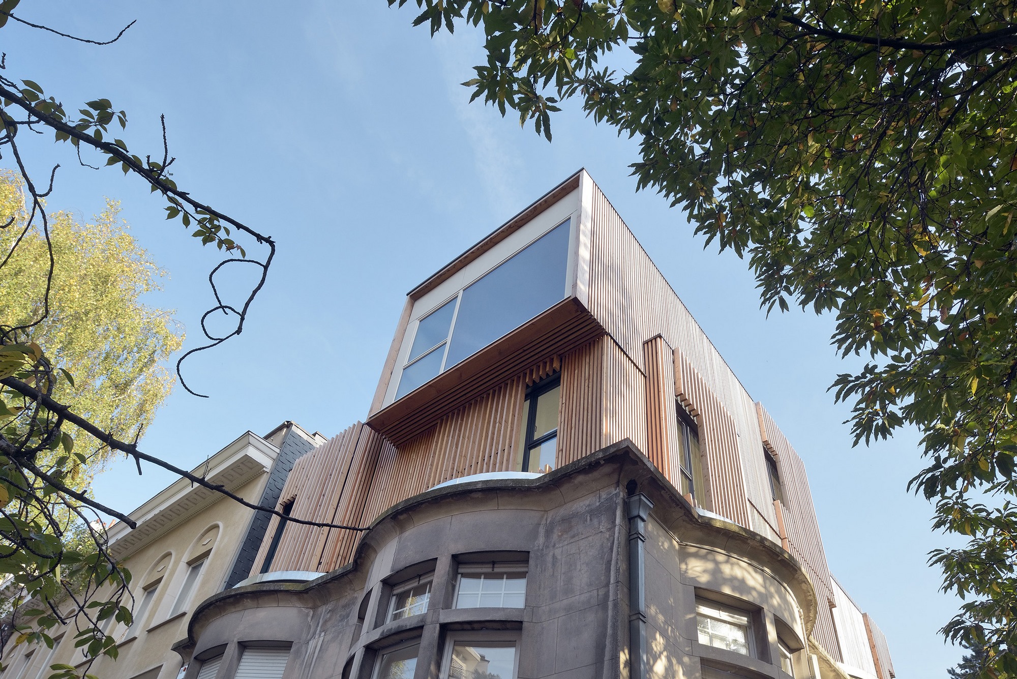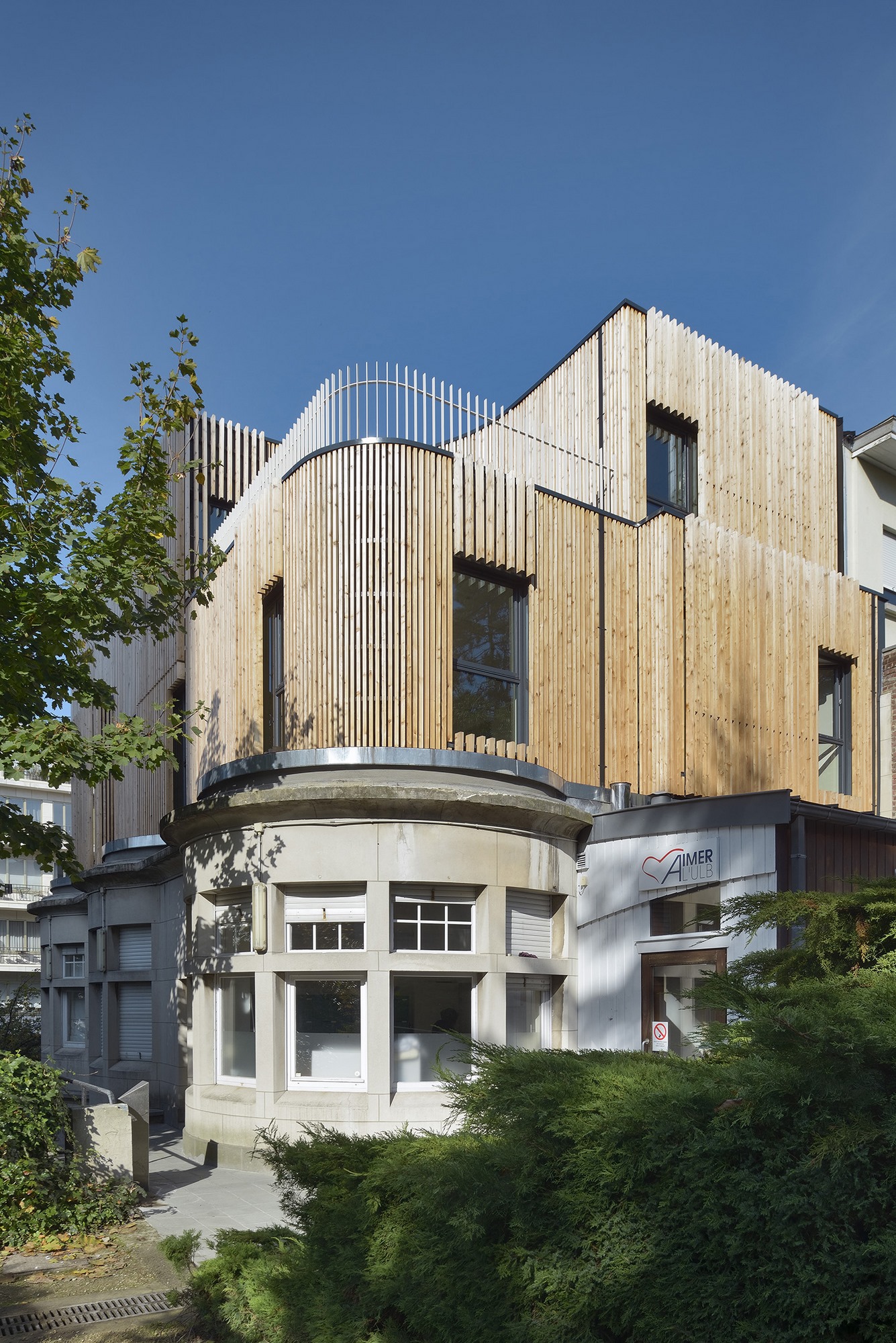 Le volume de l'extension respecte le bâtiment existant en suivant ses lignes directrices et en s’inspirant de ses courbes. Par le choix des matériaux et le dessin de sa volumétrie, le projet crée une double tension :