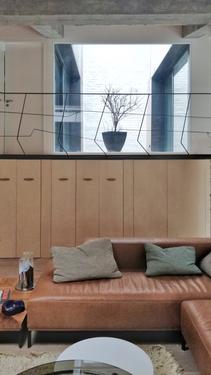 Nous avons choisi de creuser un patio à ciel ouvert au point le plus haut des niveaux de sol, à l’endroit où la lumière naturelle et vues extérieures manquaient. Ce généreux apport de lumière, via de larges baies vitrées, pourra facilement être modulé par des volets ou rideaux afin de préserver les contrastes d’ombre et lumière au sein du volum