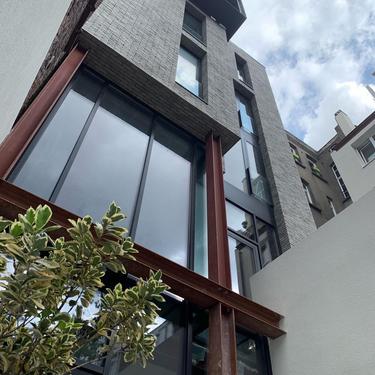 La façade avant, relativement simple assure un lien entre deux bâtiments mitoyens d’architectures et de hauteurs très différentes. Le bâtiment de droite classé est, en outre, terminé par une importante verrière qui abriait un atelier de peintre. Le dialogue est assuré par les masses de pans de brique offrant une plastique forte et la brillance et la géométrie des parties vitrées renforcées par les garde-corps. La façade arrière plus audacieuse se centre sur une faille centrale qui la parcourt de bas en haut.
