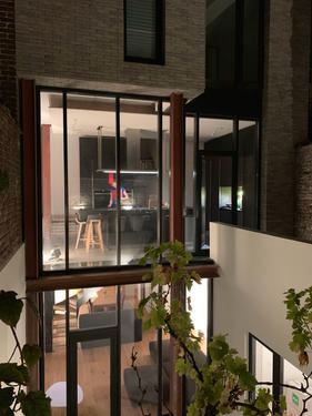 Enfin l’étroitesse du terrain et la valeur élevée du foncier ont poussé à des solutions spatiales et organisationnelles innovantes comme la mise en place de l’ensemble des pièces de vie sous le niveau du jard