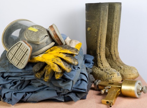 Vêtement de protection, masque et pistolet utilisés pendant l'application de mousse d'isolation en polyuréthane. Avec l'aimable autorisation d'ISOwit; Belgique, 2013. © Istvan Virag