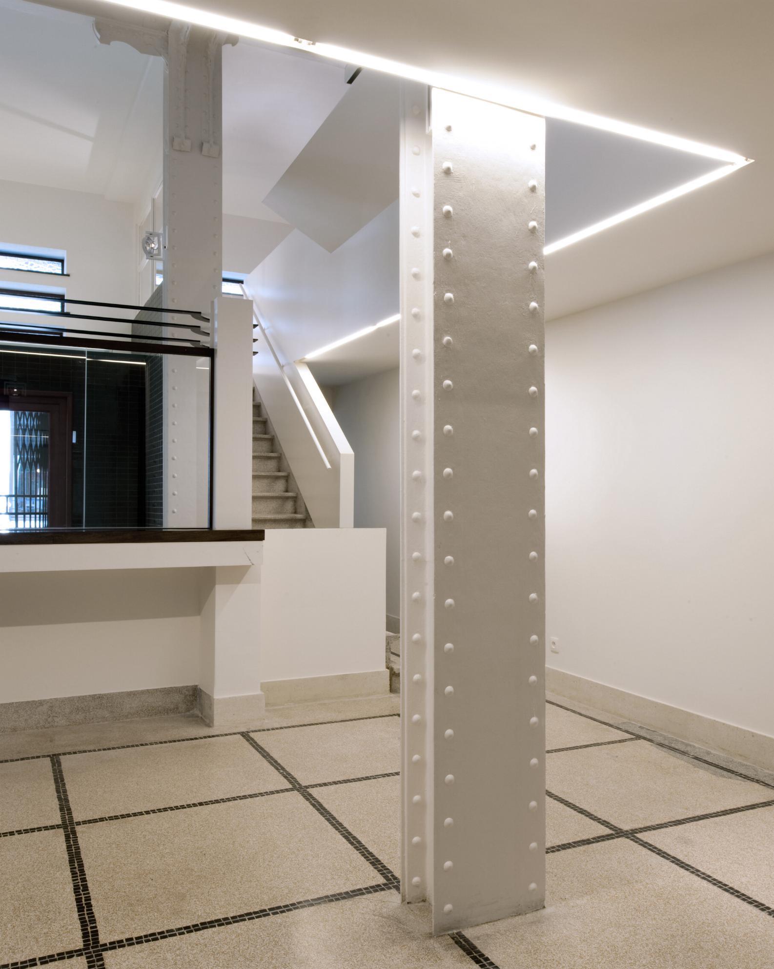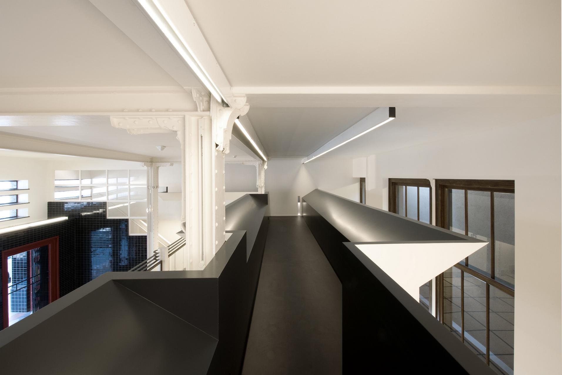 Le programme réalisé permet d’agrandir la surface utile et le potentiel d’exposition. Traversant l’espace de part en part, une passerelle offre un important développement de surface d’exposition et libère le sol du local pour en garantir la polyvalence. Ce dispositif se fond dans le contexte classé, tout en récupérant les vestiges d’un escalier partiellement disparu.