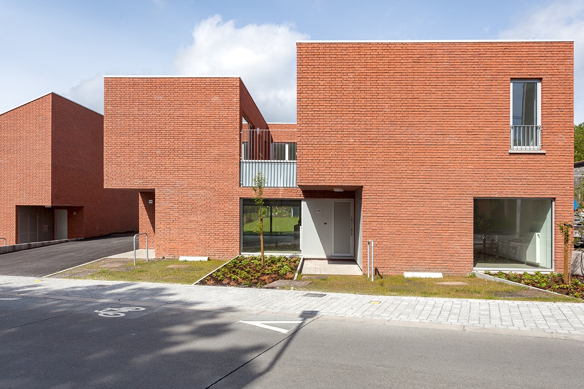 L’emboîtement des maisons permet de créer un jeu volumétrique marquant leur entrée. Cette séquence des habitations en “escaliers” débute via les pignons des voisins immédiats. Un petit jardin est prévu en façade avant afin de privatiser l’entrée dans le logement par rapport à l’espace public. Une place de stationnement est aussi aménagée devant chaque maison.