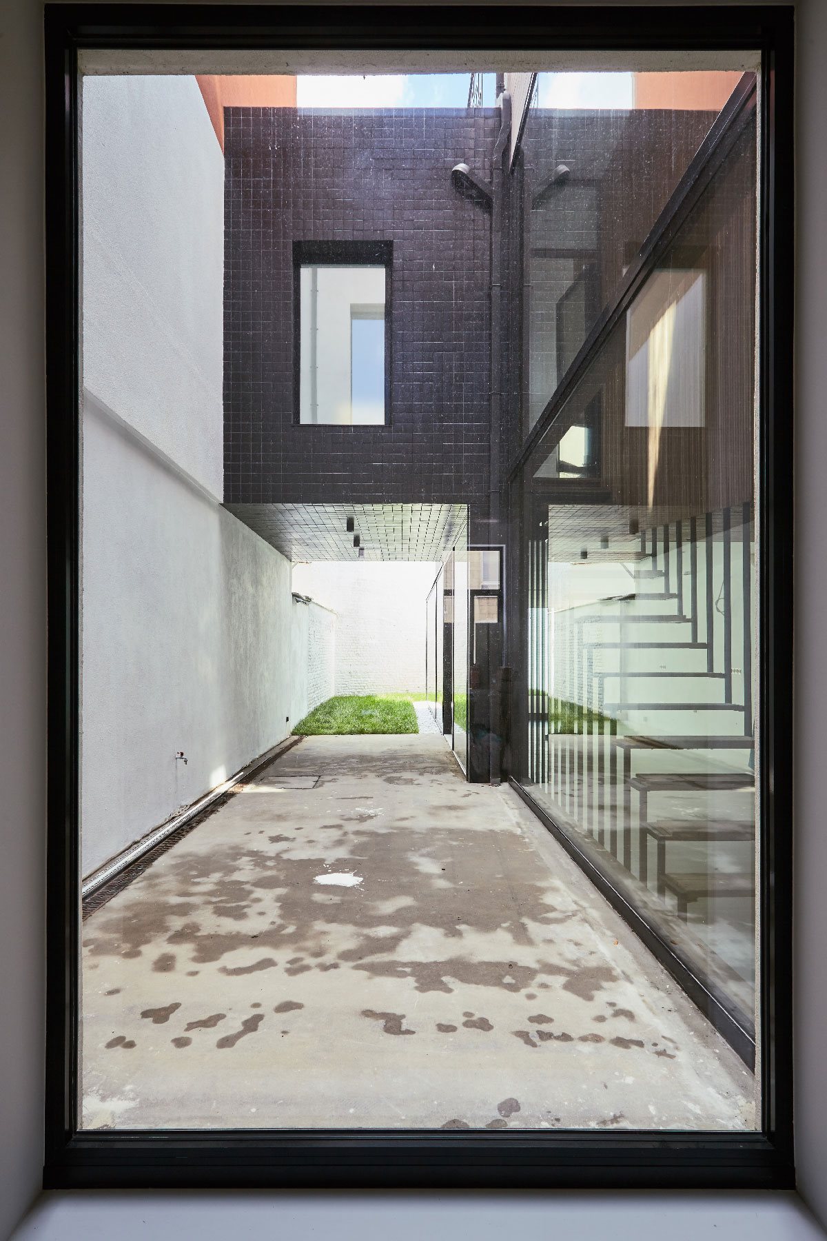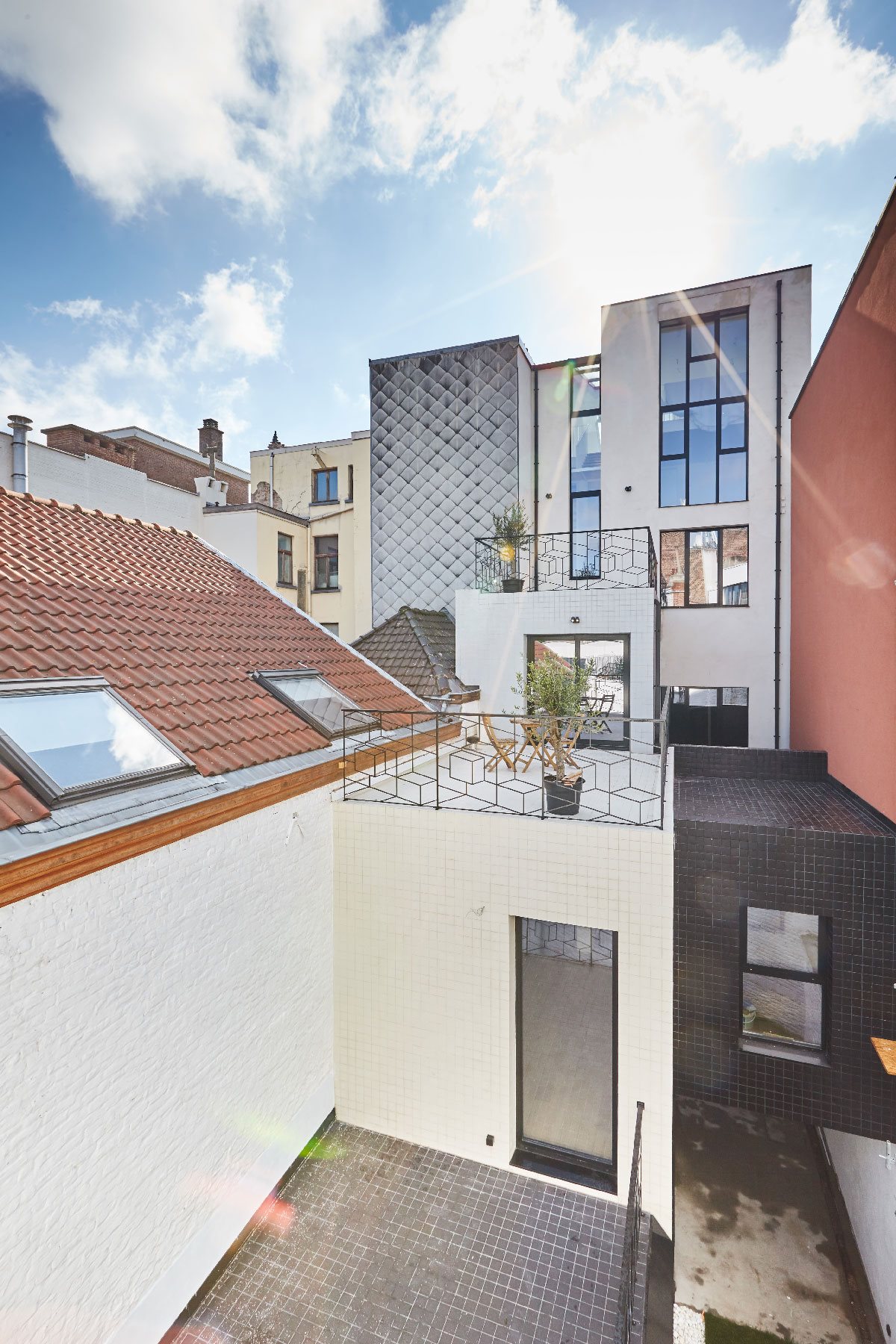 Dans un îlot très dense à proximité de l’animation de la place Fernand Coq, une maison de rapport typique bruxelloise se voit greffée d’un emboîtement de parallélépipèdes rectangles en façade arrière.