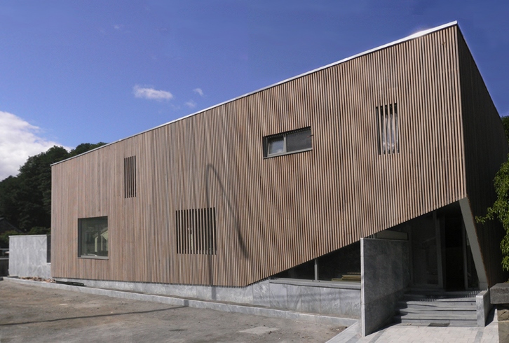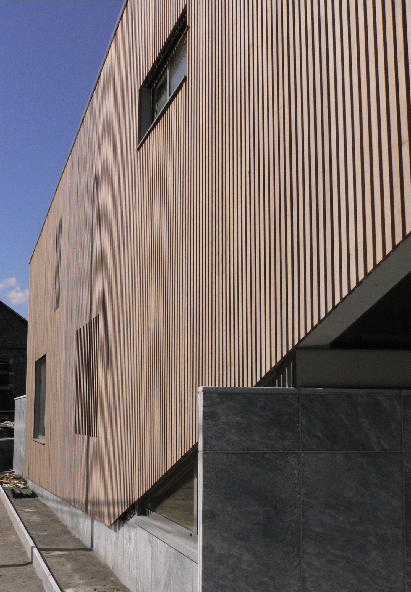 L'intervention nécessite une proposition homogène qui redéfinit le rapport de l'image de la maison à la rue. Située au bord d'une voie fort fréquentée, la façade en bardage bois est utilisé comme un mur anti-bruit. La façade, par ses fines lames verticales de bois ajourées est utilisée comme un écran plus ou moins translucide enveloppant le bâtiment.