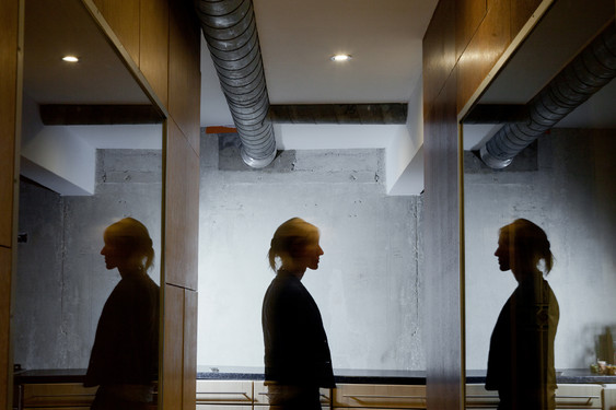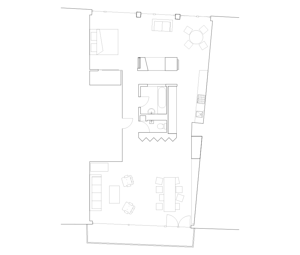 Contrer cette insuffisance tout en exploitant le plein potentiel de cette situation exceptionnelle, du cosmétisme mobilier ne suffit pas, c’est un changement d'échelle radical de l'appartement qui est mis en place. Tous les murs non porteurs sont retirés au bénéfice d’un espace primaire, fluide, suspendu dans l'entre- deux des vues sur le paysage qui s'étend. Le noyau central restant est enveloppé dans une texture unique, lui sont juxtaposés trois autres éléments de mobilier dont l’emplacement stratégique et l'interaction spatial génèrent les conditions d'utilisation, permettant de subdiviser et recomposer l'appartement confortablement dans une variété de situations formelles ou informelles.