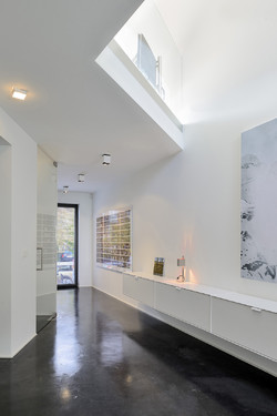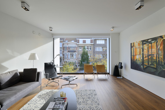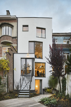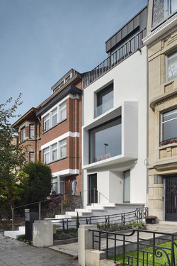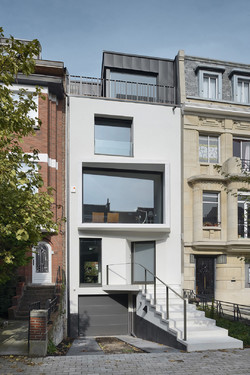 Ce projet rencontre le souhait d’un amateur d’art demandeur d’un écrin pour lui et ses œuvres. Le projet rencontre deux ambitions : celle de se faire discrète au profit des œuvres d’art et celle de présenter une architecture graphique qui soit une œuvre en soi. La proposition consiste en une image très minimaliste en façade, blanche, scandée par de grandes ouvertures qui «maîtrisent» la lumière naturelle. Elle s’accroche à la tradition des maisons classiques bruxelloises par la position des espaces servants, alignés le long du mitoyen. Par contre, il s’en différencie par son travail sur la lumière. En effet, l’étroitesse de la parcelle et la profondeur de la maison ont entraîné la création d’un volume intérieur sculpté par des obliques qui élargissent les pièces de vie. Le vide créé est utilisé pour canaliser la lumière naturelle depuis le toit vers les différents étages, à travers le centre de la maison.