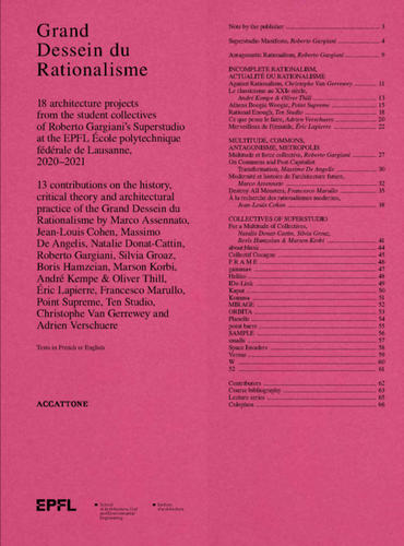 ACCATTONE - Grand Dessein du RationalismeGrand Dessein du Rationalisme est une publication hybride qui rassemble 18 projets d'architecture des collectifs d'étudiants du Superstudio de Roberto Gargiani à l'École polytechnique fédérale de Lausanne, 2020-2021, et une série de 13 réflexions théoriques, pratiques et historiques sur le rationalisme (antagoniste) en architecture.