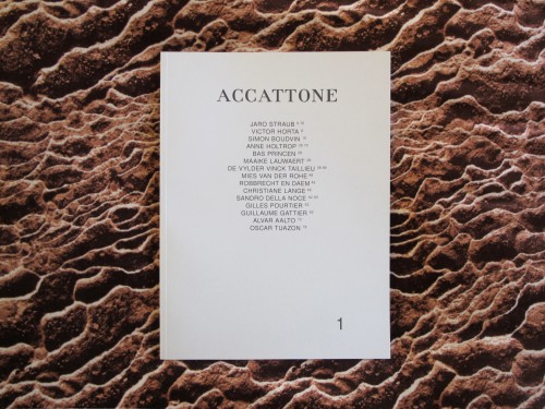 Accattone est une revue imprimée qui donne place aux documents : un essai, une interview par images, des dessins, engagent une lecture à entrées multiples, révélant les thématiques sous-jacentes. Le caractère implicite de l'analogie est préféré à la sur-détermination du texte analytique. Explorant la portée critique de l'image, les dispositifs d'édition tentent d'aller au-delà du constat, simpliste, que seules les revues textuelles sont critiques, et que la condition contemporaine de la culture architecturale – définie par la surabondance des images – est nécessairement a-critique ou post-critique. Loin des mécaniques de production–consommation des média numériques, le format imprimé et sa lente périodicité combinent les caractéristiques du work in progress et de l'objet fini.Accattone #1
